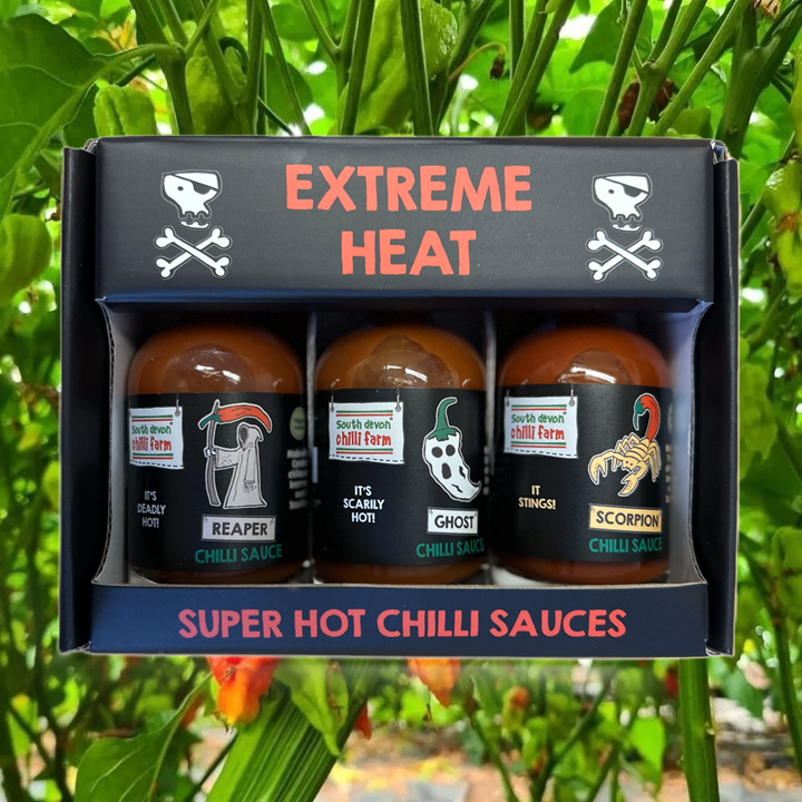 All three of our 'Super' chilli range, our hottest sauces to date! in a great looking gift pack. If you know someone who loves really hot chillies, they'll love these sauces, just tell them to go steady when they try them until they know how much they need to reach the perfect heat! Packaged in pocket-sized bottles as you only need one drop for extreme heat. These extremely hot and fruity sauces are made with just fresh chillies (grown here on the farm), spirit vinegar and salt (no artificial additives or extracts).